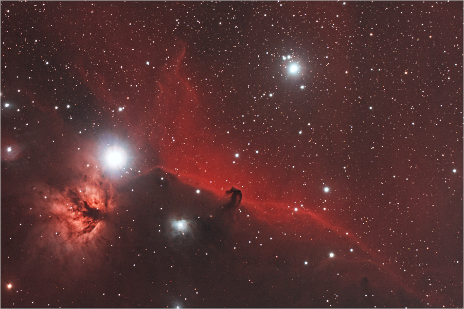 Snímek okolí hvězdy Alnitak s mlhovinou Koňská hlava a Plamínek, je první snímek focený novou digitální zrcadlovkou 40D upravenou na astrofotografii. I když podmínky na fotografování byly otřesné, snad nejhorší které jsem kdy zažil. Od odpoledne začal přicházet vítr, který místy přecházel na silný nárazový vítr ,to co vyváděl s celou sestavou je nepopsatelné. Tv Guider při pointování dělal co mohl, aby pointační hvězdu udržel ve středu kříže, na několika dílčích snímkách jsou vidět protáhlé hvězdy, které nestihl Tv Guider vyrovnat. Ale i tak po shlédnutí prvních záběrů nové zrcadlovky, jsem uviděl snímky krásných emisních červených mlhovin a tak mi spadnul kámen ze srdce, že operace rozebrání a vyjmutí původního filtru ze zrcadlovky nebyla zbytečná. Další kapitolou je samotné zpracování. Původně byl snímek složen klasickou cestou programem Subraw, Registar, Photoshop CS3, ale po dlouhých debatách s kolegou Martinem Vyhlídalem a následném jeho zpracování v programu ImagesPlus, jsem dospěl k přesvědčivému názoru o vhodnosti tohoto programu pro další (kvalitnější) zpracování. Pro to bych chtěl Martinovi poděkovat za jeho několika denní vysvětlování onoho problému a následné domluvení koupi tohoto programu. Snímek je složen z 10 dílčích snímků z původních 17, které nebyly odeslány na zpracování, ale i tak je oproti dřívějšímu snímku (viz.níže) vidět kvalitnější zpracování a enormní rozdíl mezi digitálními zrcadlovky 300Da a 40Da.