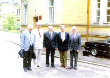 Setkání československých astronomů na přírodovědecké fakultě MU v Brně v r. 1993. Zleva prof. Vladimír Vanýsek [UK Praha], prof. Miroslav Vetešník [MU Brno], prof. Anton Hajduk [TU Trnava], JG a Dr. Vladimír Porubčan [SAV Bratislava].