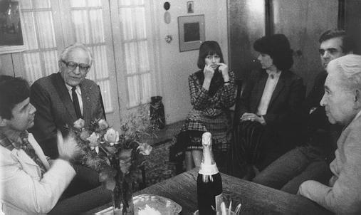 Na návštěvě u básníka Jaroslava Seiferta v jeho břevnovské vilce v červnu 1985. Zprava Jaroslav Seifert a jeho přátelé, uprostřed má žena Libuše, vlevo v brýlích slavný atlet-koulař Ing. František Douda a JG v bílém.